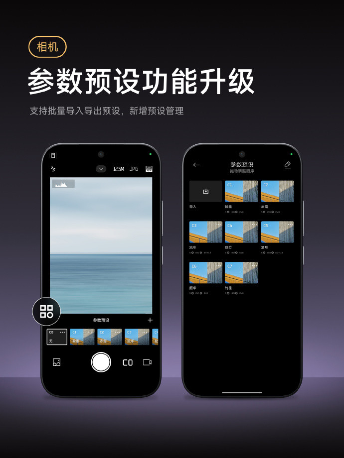 此外,预设的传输功能也将更加便捷,支持批量导入导出,可通过压缩包互相传输预设,也可以通过扫码导入官方“马上准备”发布的预设包。
