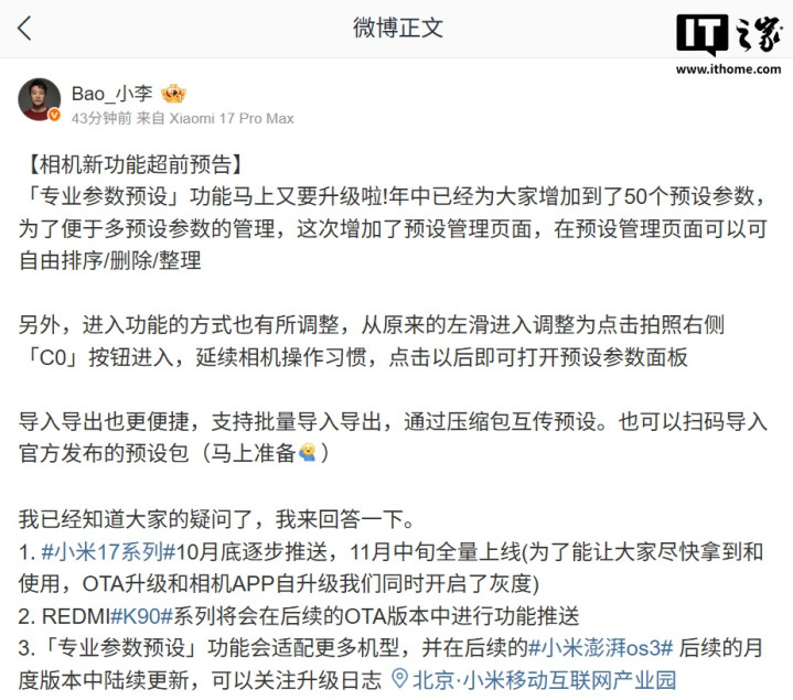 IT之家10月29日消息,小米相机部产品经理@Bao_小李今天在微博发文,透露小米17系列手机相机将更新专业参数预设等新功能。